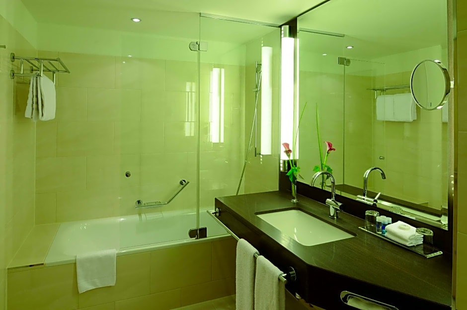 Elegantly furnished room has a fantastic view of Düsseldorf Airport, the city center and the surrounding area. Located on the highest floor and equipped with a mini-bar. It is equiped with a modern interior, ceiling-high windows and flat-screen TV.